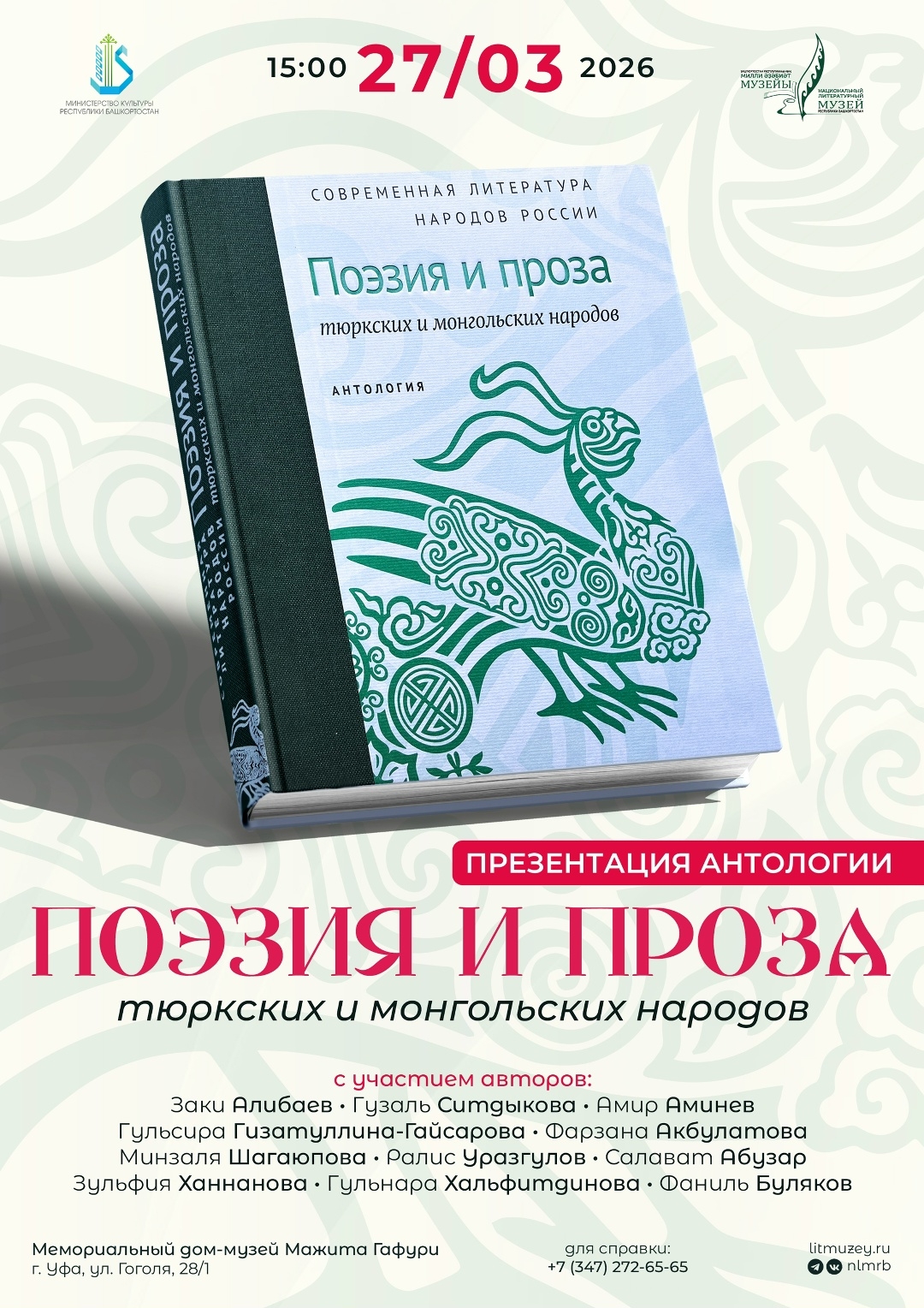 Национальный литературный музей Республики Башкортостан приглашает на презентацию антологии "Поэзия и проза тюркских и монгольских народов". Очередная антология серии включает лучшие образцы современной поэзии и прозы тюркских и монгольских народов. Новый подход к изданию призван более широко представить литературы одной языковой группы или нескольких близких, лингвистически и исторически связанных между собой.